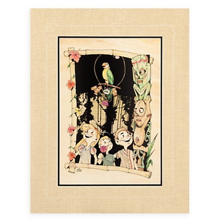 Three happy kids take in the wonder of ”The Enchanted Tiki Room” in this deluxe print. Artist Brian Crosby captures the Polynesian delights of the beloved attraction with host Jose and the Tiki totem keeping its eyes on the children.