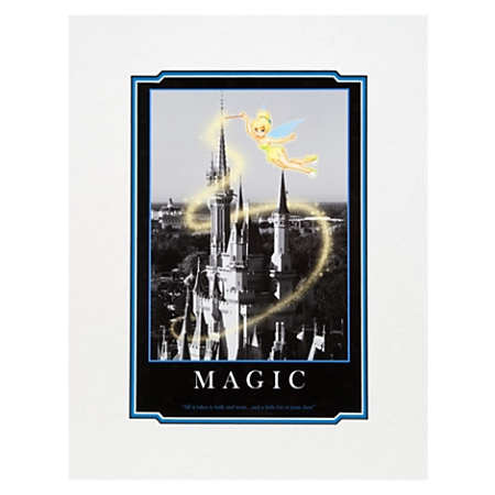 Tinker Bell soars high above Cinderella Castle in this celebration of the Magic of Walt Disney World. The art print features Peter Pan’s famous quote about flying, ”All it takes is faith and trust . . . and a little bit of pixie dust!”